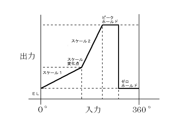 - 零ホールド機能は、シンクロ発信機が零点位置よりもマイナス方向に回転した場合に異常に大きな値を出力(たとえばマイナス1度のとき359度に対してスケーリング)してしまうことを抑制します。